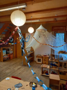 Unsere Freiwillige hatte sich kreativ betätigt und bunte Girlanden gebastelt. Die schwebten während der Faschingsparty über den angemalten, verkleideten und höchst konzentrierten Krippenkindern.