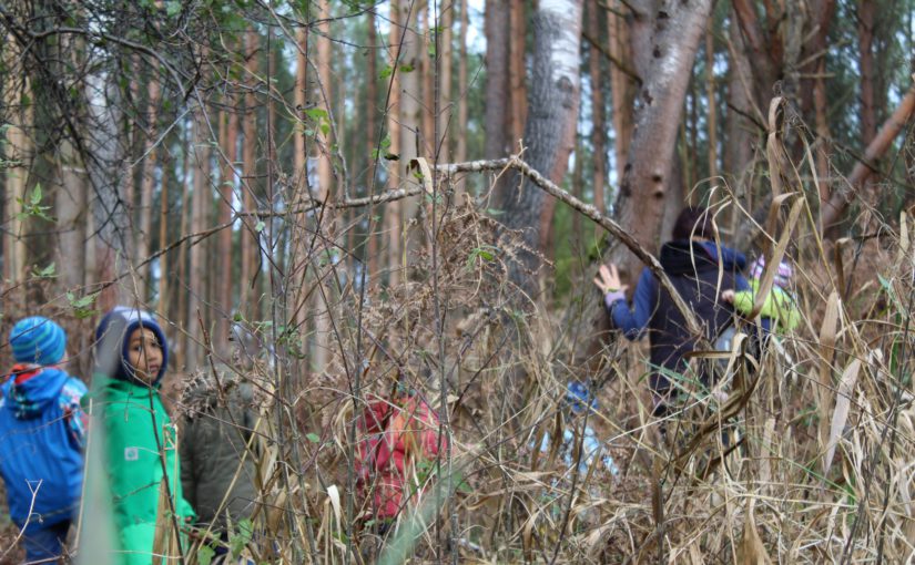 Weil unsere Kinder gerade vom Jagdfieber erfasst wurden, gingen wir am letzten Waldtag auf Wildschweinjagd – allerdings ohne Pfeil und Bogen oder Büchse, sondern ganz leise schleichend im „Fuchsgang“, mit Kamera und Spurenbuch. Wir lernten, was Wildschweine gerne essen, fanden ihre Fußspuren, Malbäume, Suhlen und ihre Pfade, suhlten uns selber genüßlich im Matsch und beobachteten nebenbei Schwarzspechte und Kolkraben. Auf jeden Fall sind wir jetzt begeisterte Wildschweinexperten und die Kinder gestalteten ein Plakat mit „Max Mio“ – unserem Wildschwein.