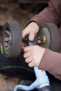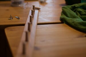 Wir haben Laufräder, Bobbycars und Vierräder vom Winterdreck befreit, Haken für die kleinen Rucksäcke angebracht, eine Treppe gesichert, einen Zaun repariert und die Rutsche an einen besseren Platz umgesetzt.